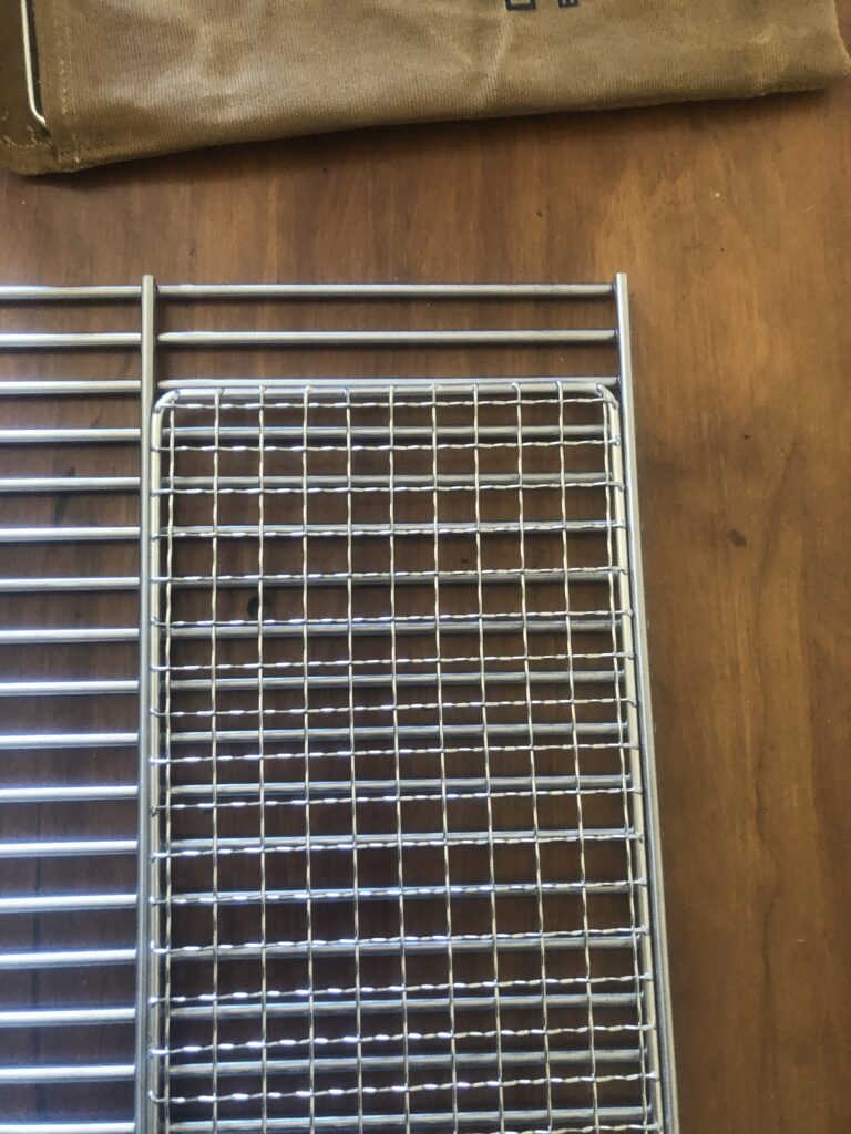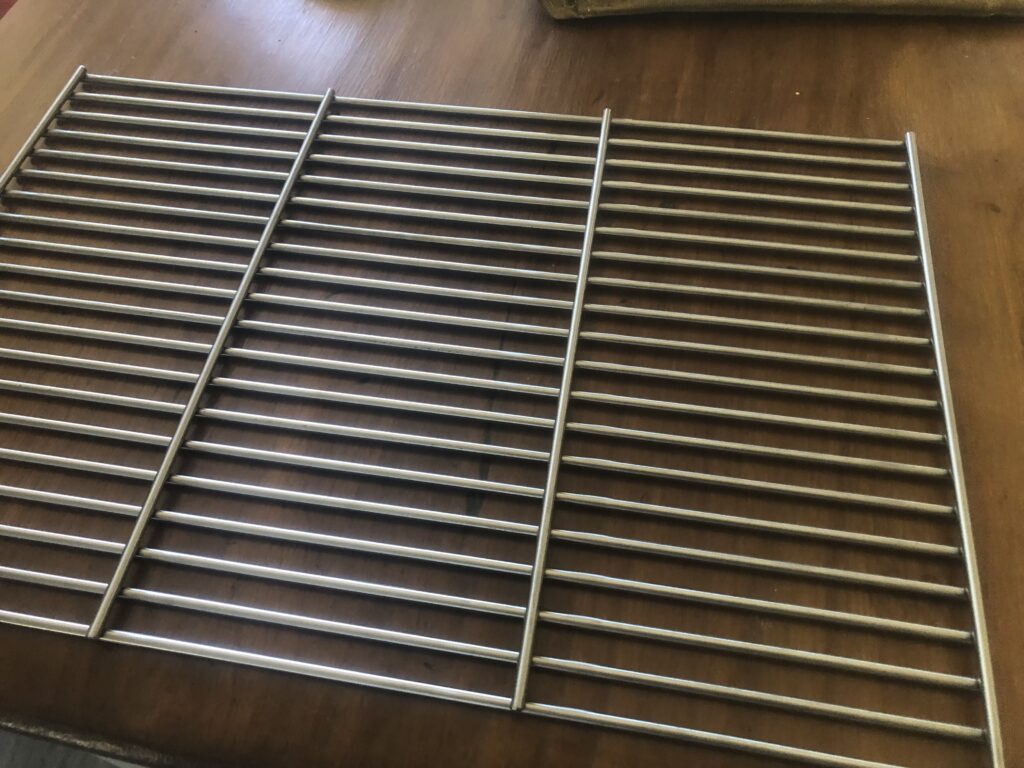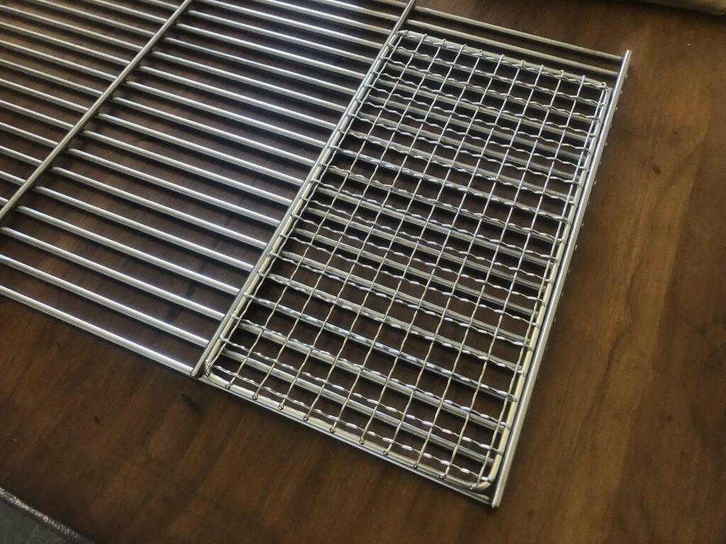 I purchased the grill from a BBQ shop and it worked out that the mesh style grill fits exactly within the frame work. Just nip and tuck along the long side and two rungs across the to to fit in the canvas bag. Ill have one mesh and one stainless rung style grill and two extras.