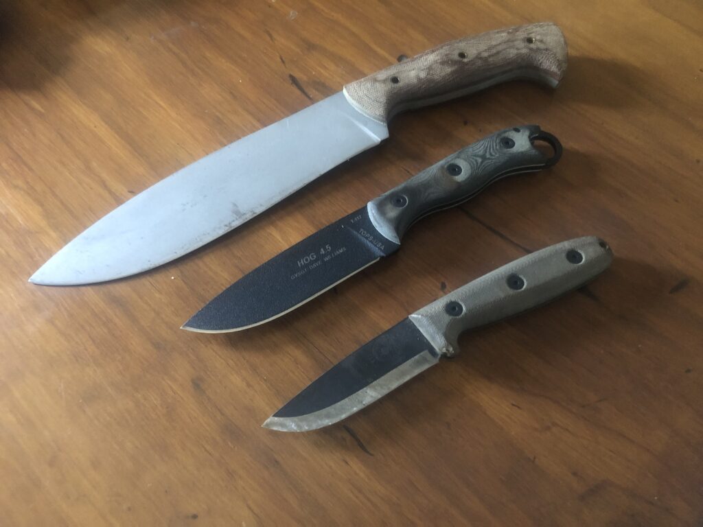 I ended up choosing an ESEE RB3 for the small blade. I wanted atleast one with a scandi grind. The Tops HOG 4.5 for the medium and for the large an 8 inch Crowner Bolo in 3V.